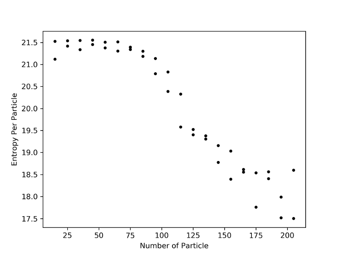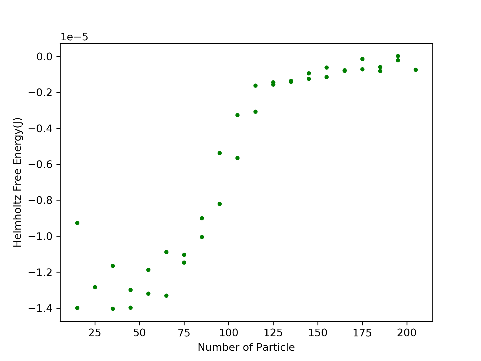 The phase transition is found near N ~ 100 from the discontinuity in free energy, indicating a second order phase transition.